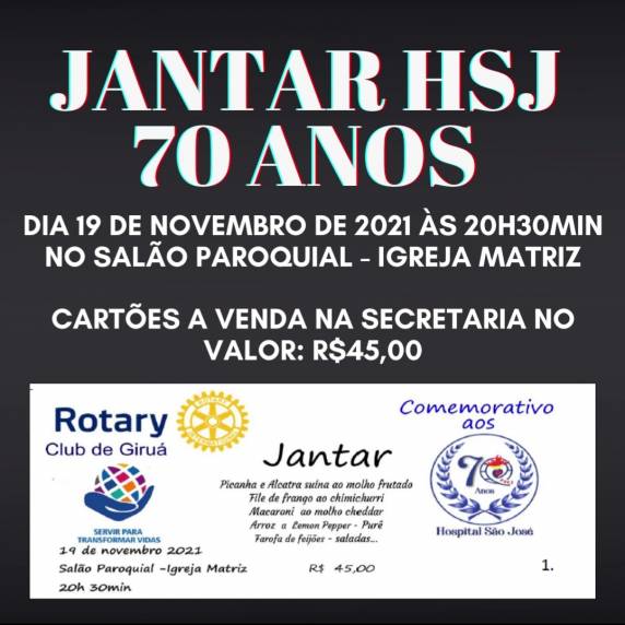 O Rottary Club de Giruá, juntamente com o Hospital São José promovem no dia 19/11/2021 o Jantar Comemorativo aos 70 anos do Hospital.
