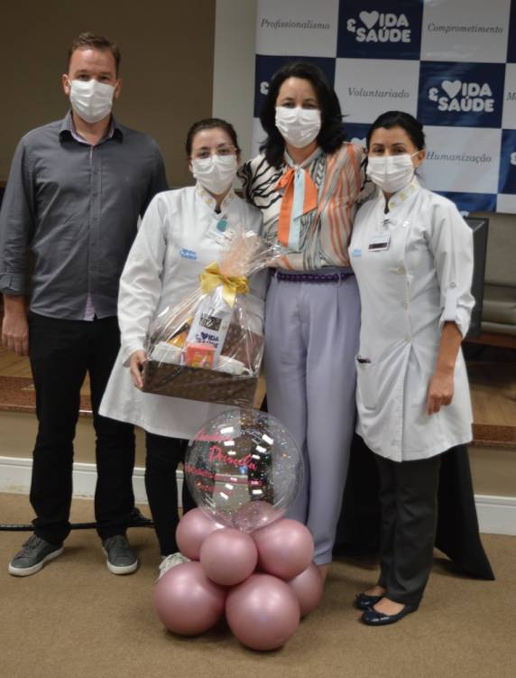 Há dois anos na Instituição, a profissional integra a equipe do Serviço de Nutrição e Dietética do Hospital, coordenado pela nutricionista Sabrina Dal Molin, e é a responsável pelo serviço de nutrição na Oncologia. Recentemente, a nutricionista foi homenageada por colegas do setor e pela direção do Hospital, através da diretora-geral Vanderli de Barros e do diretor de infraestrutura, Rodrigo Calixto.