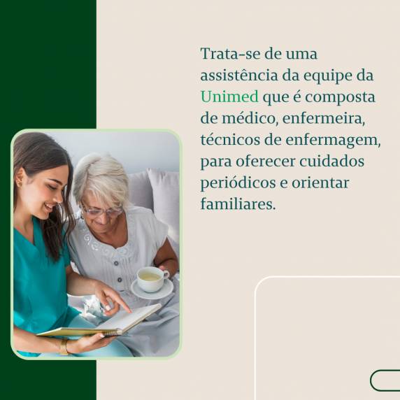 Trata-se de uma assistência da equipe da Unimed que é composta de médico, enfermeira, técnicos de enfermagem, para oferecer cuidados periódicos e orientar familiares.