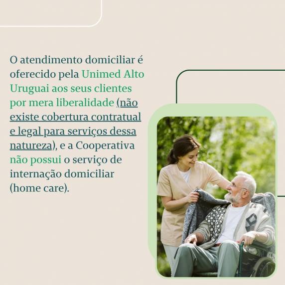 O atendimento domiciliar é oferecido pela Unimed Alto Uruguai aos seus clientes por mera liberalidade (não existe cobertura contratual e legal para serviços dessa natureza), e a Cooperativa não possui o serviço de internação domiciliar (home care).