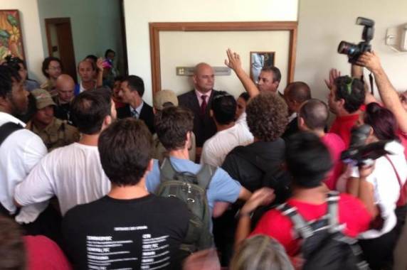 do estado, Eduardo Deschamps, precisou sair da sala de reuniões com auxílio de seguranças.