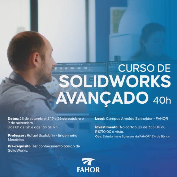 O curso será ministrado pelo Engenheiro Mecânico Rafael Scalabrin, no Campus Arnoldo Schneider, com um investimento de 2x R$355,00 e 15% de desconto para estudantes e egressos da FAHOR. As aulas acontecerão nos dias 28 de setembro, 5 de outubro, 19 de outubro, 26 de outubro e 9 de novembro, das 8h às 12h e das 13h às 17h.