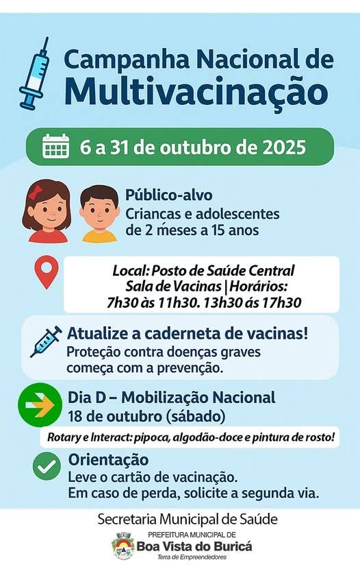 A Prefeitura Municipal de Boa Vista do Buricá, por meio da Secretaria de Saúde, dará início no próximo dia 6 de outubro à Campanha Nacional de Multivacinação, que seguirá até 31 de outubro de 2025. A mobilização tem como público-alvo crianças e adolescentes com idades entre 2 meses e 15 anos, que estejam com doses em atraso ou ainda não aplicadas em suas cadernetas de vacinação.
